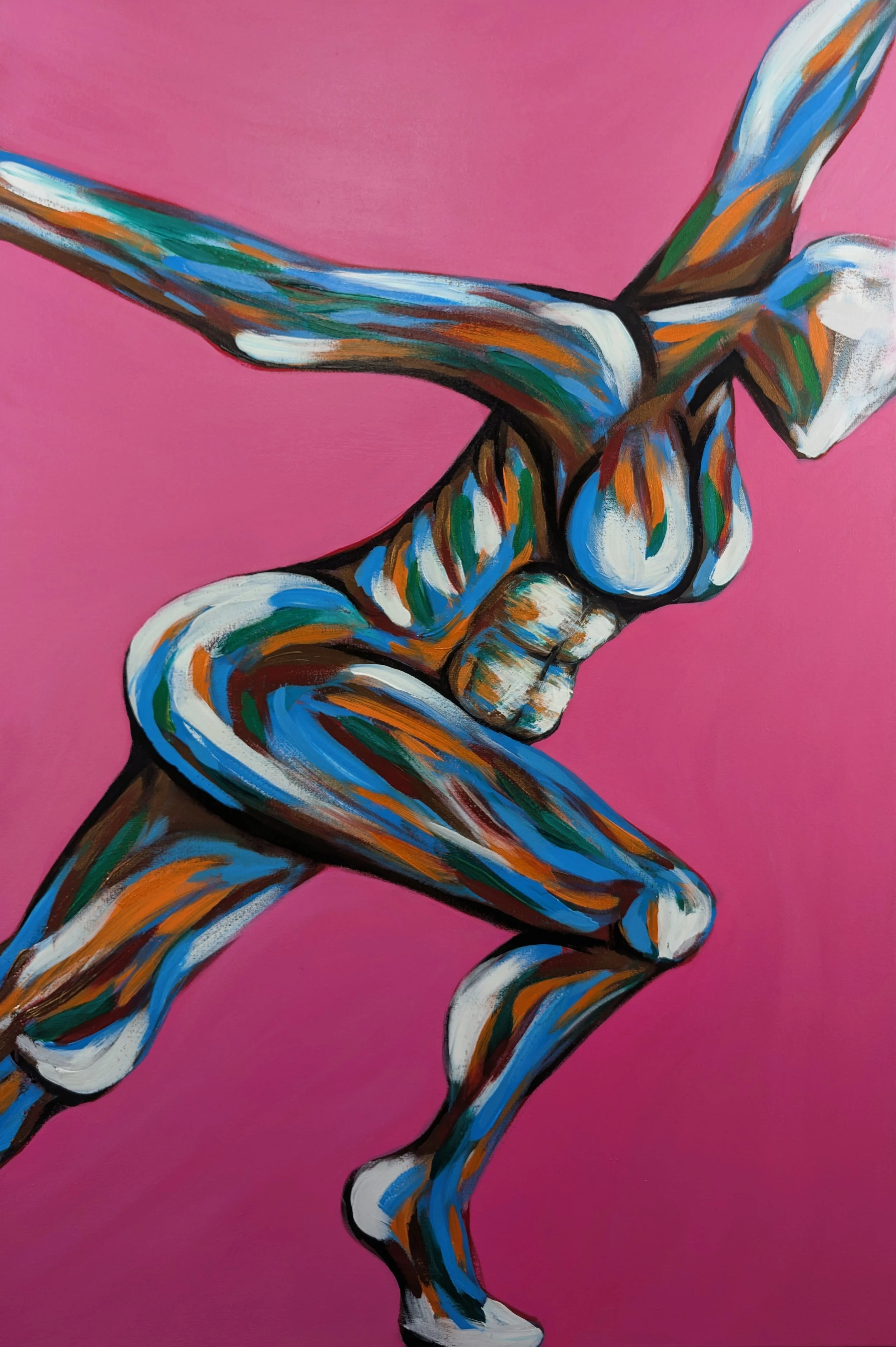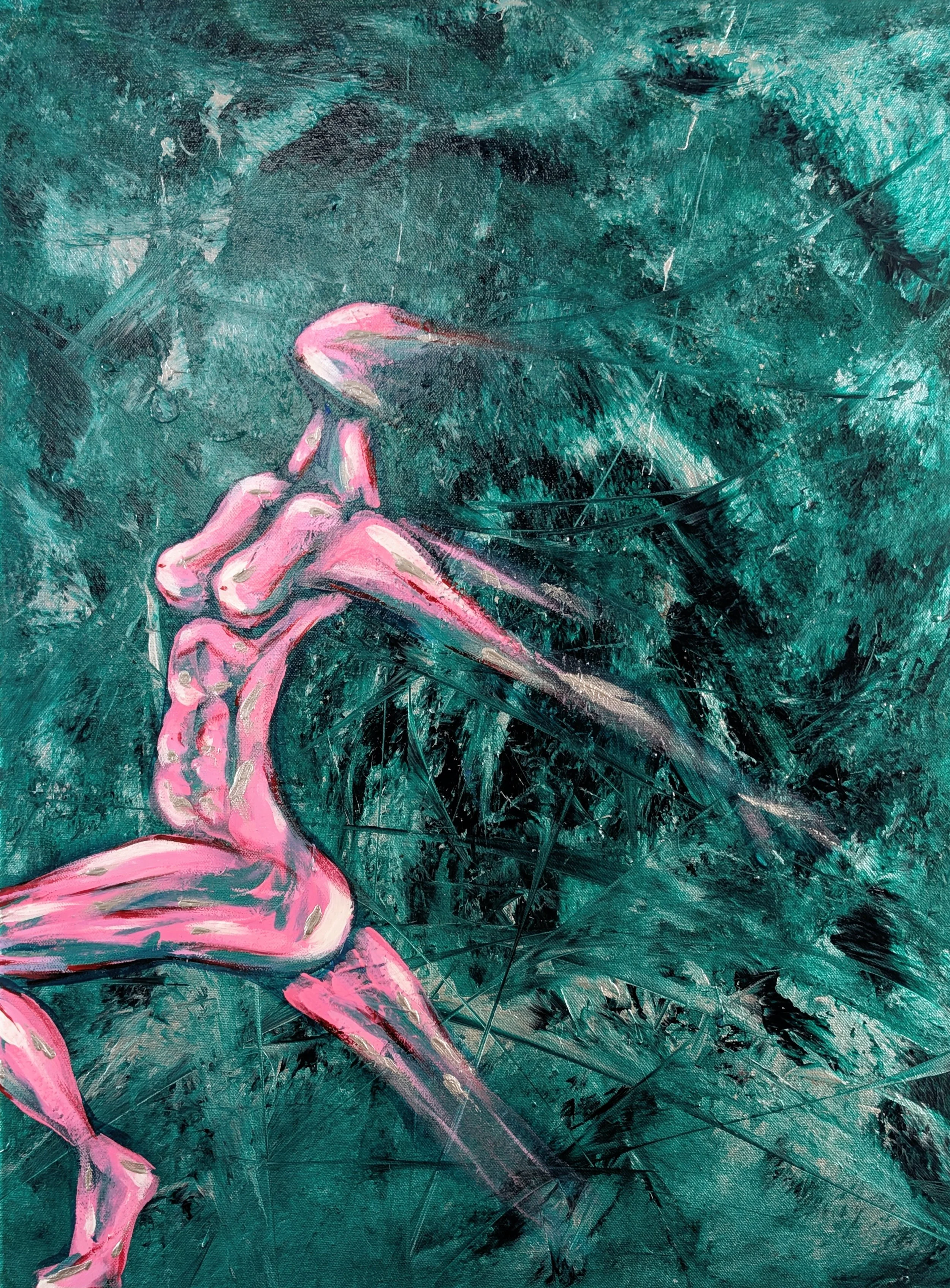 "Breakout" captures the body in a moment of raw, violent freedom. The figure painted in an aggressive and luminous pink, fights against the canvas, emerging from a dense, chaotic field of deep green and sharp teal.